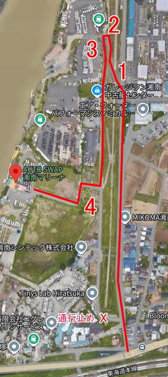 堤防工事のため出入口が変更になっております。 国道1号から土手沿いの道に入りすぐに入る道は現在柵で通行止めになっております。 そこからさらに400mほど進みますと土手沿いにリバーポートマリーナ様の案内看板が有り、そこにオートスワップ湘南マリーナの案内看板も設置してあります。 1 土手沿いを上がる形で入るとその先に次の案内看板が見えてきます。 2 スロープを下りUターンする形で進みます、トレーラーをけん引されている場合はUターン時に狭いのでご注意ください。 3 真っすぐ進むと案内看板が出てきますので案内板に従ってお進みください、路面の舗装がなくなりますが道に沿って進むとオートスワップ湘南マリーナの駐車場がございます。 4 住所 〒 254-0023 神奈川県平塚市馬入2053 TEL 0463-53-8721 メールアドレス marina_master@autoswap.jp 運営管理 株式会社 M`s Planning